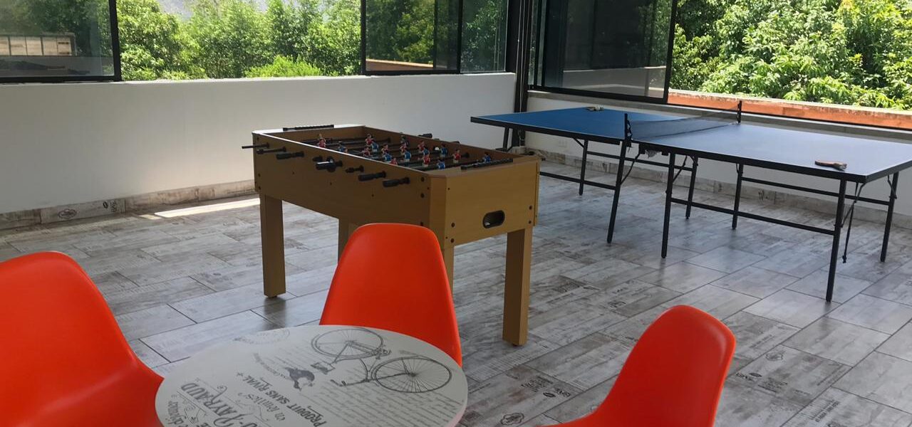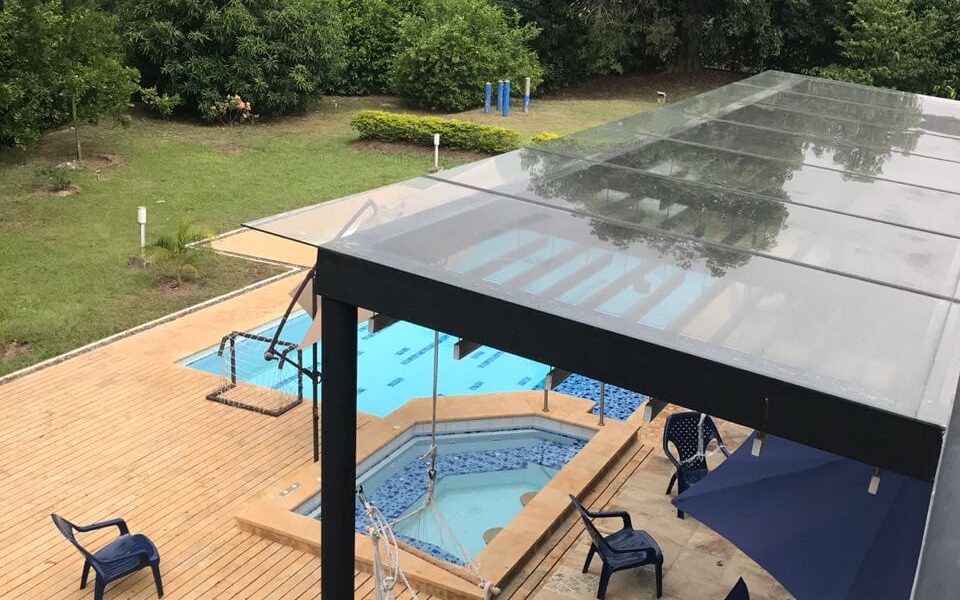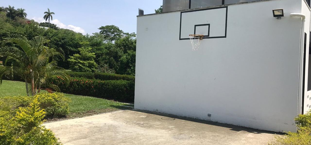 La sala tiene aire acondicionado central, piscina, árboles frutales en producción, 3 aguas, topografía plana.