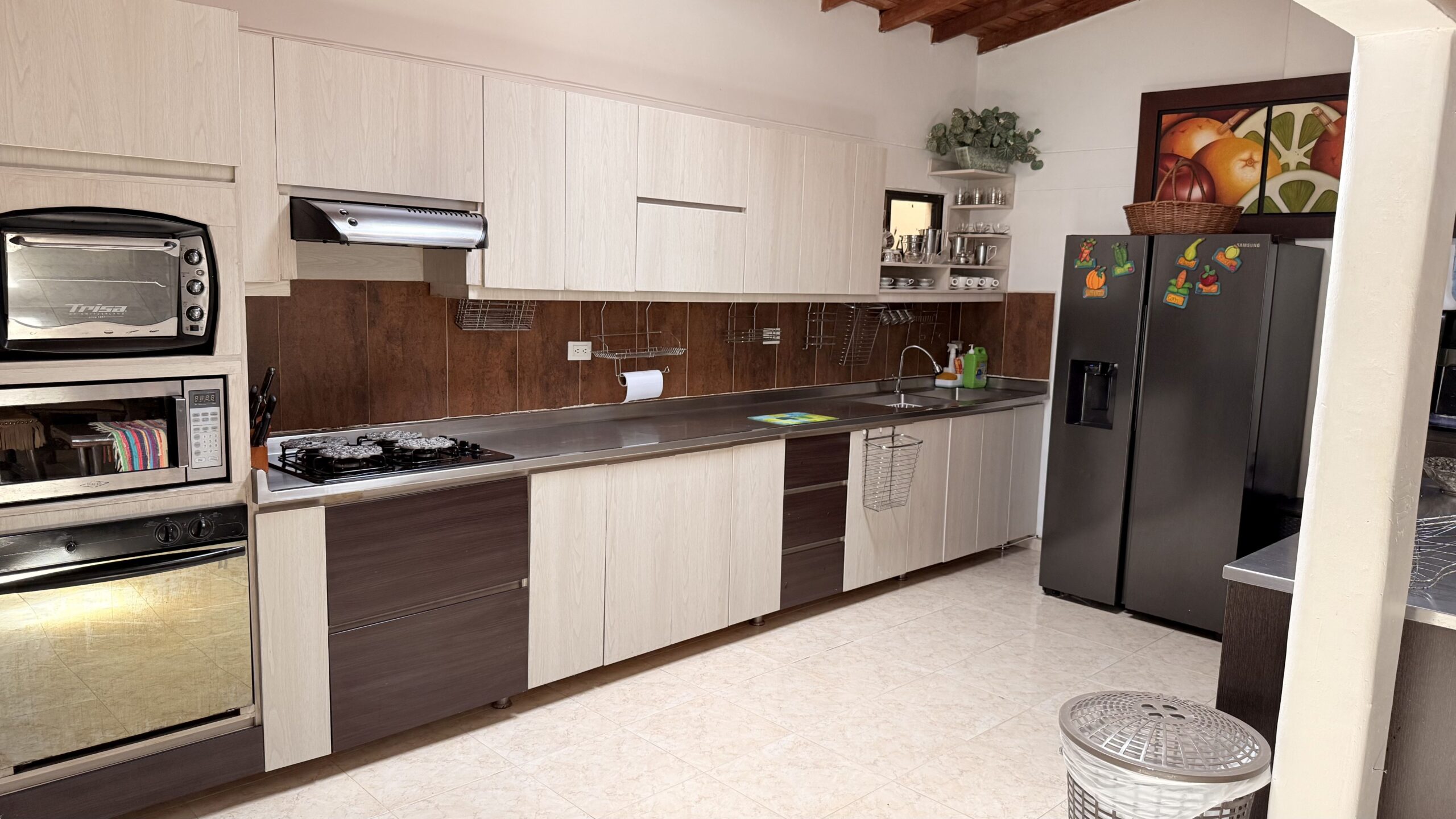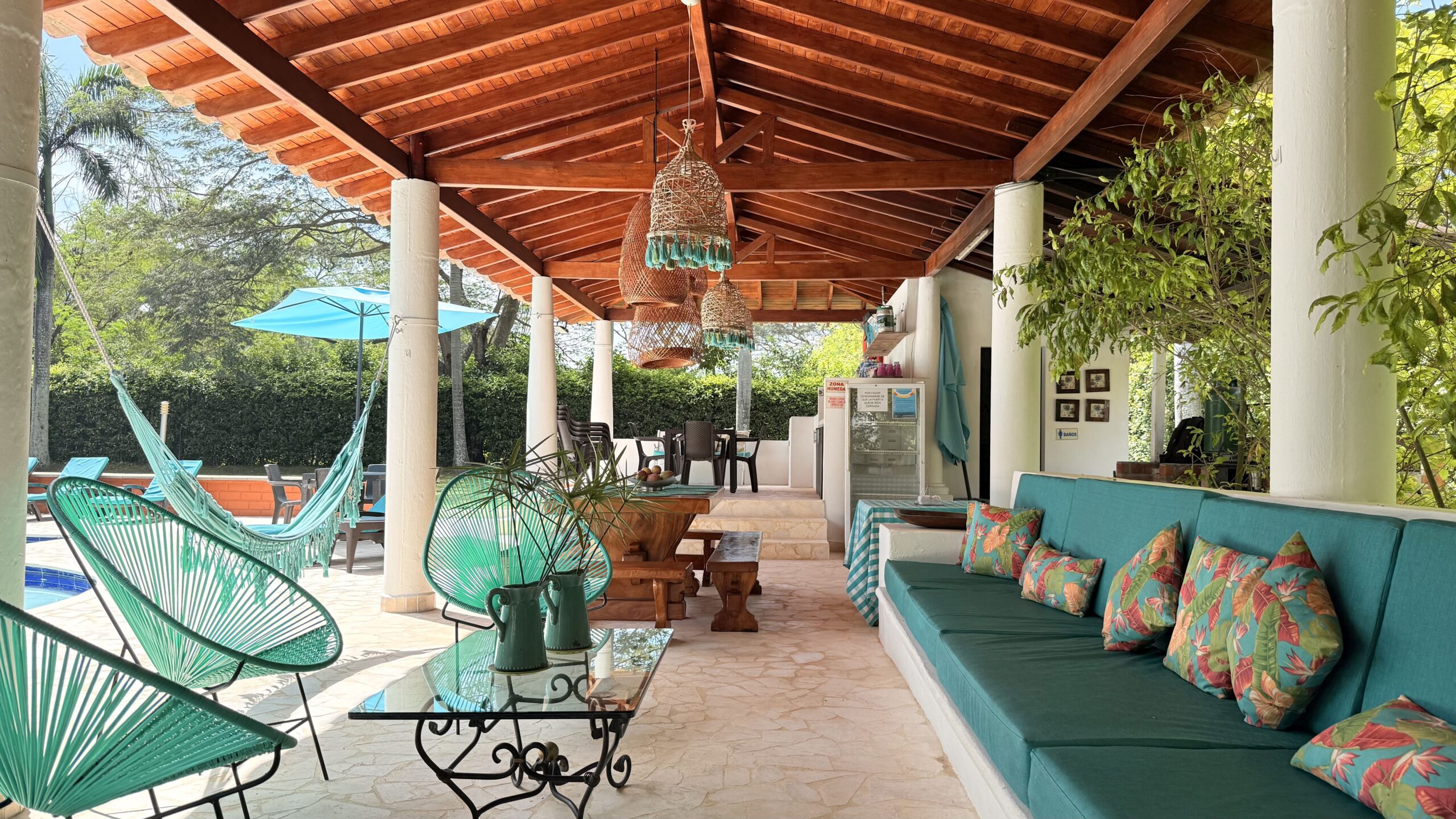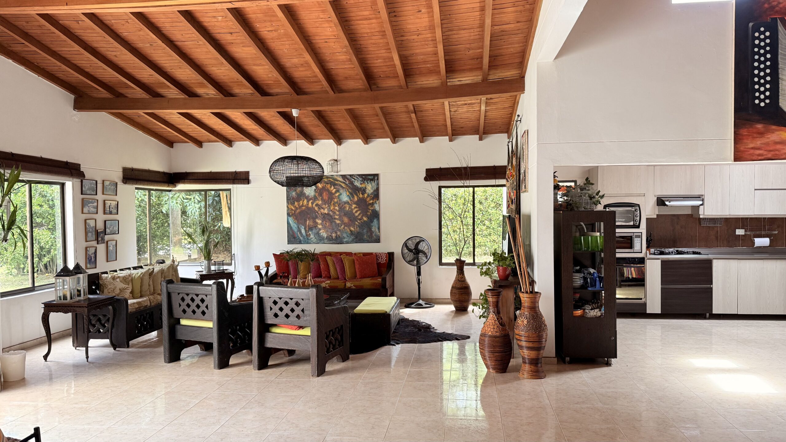 La casa es de un solo nivel, muy moderna, detalles de lujo , 5 alcobas con aire acondicionado, , 7 baños, cocina integral, zona de ropas, sala comedor independiente, kiosco externo con asadero, piscina muy amplia, zona verde, árboles frutales en producción, muy buenas aguas.