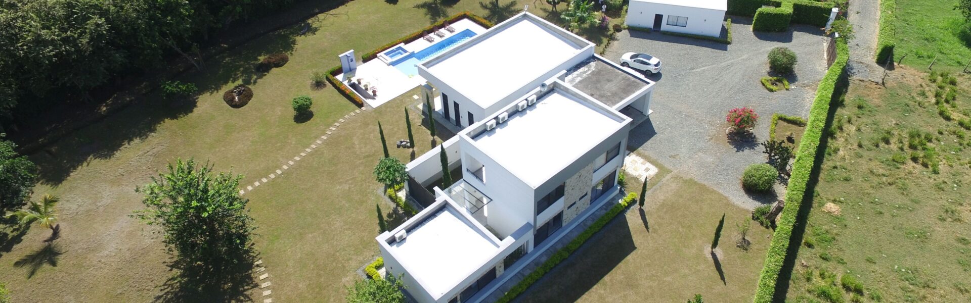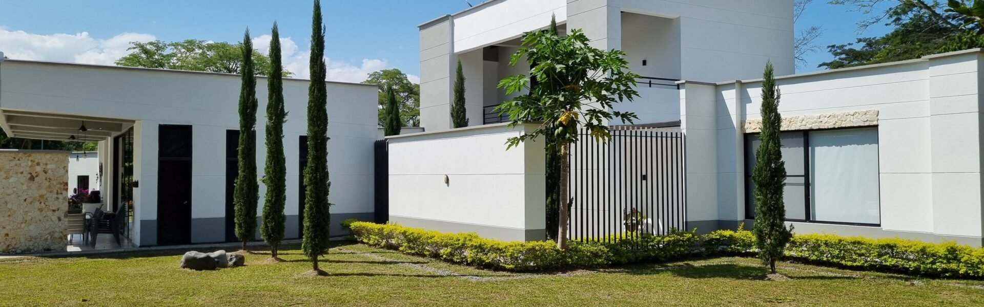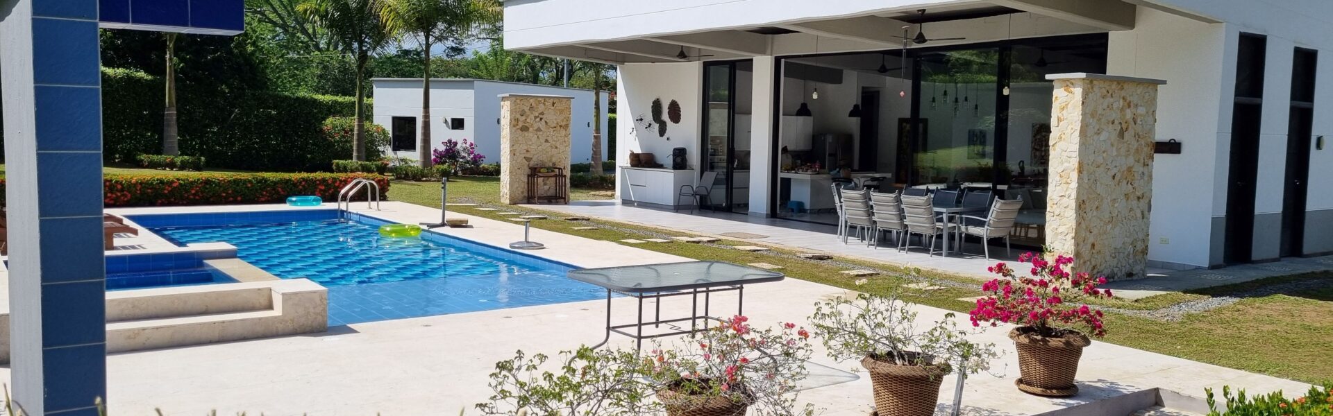 La Casa es de dos niveles  con muy buenos acabados, cuenta con 5 alcobas muy iluminadas con aire acondicionado, baño y vestier, mas la alcoba de la empleada domestica, sala comedor independiente, cocina integral abierta de lujo, zona humeda, balcon, patio central, estadero, piscina, yacuzzy, topografia plana, arboles frutales en produccion.