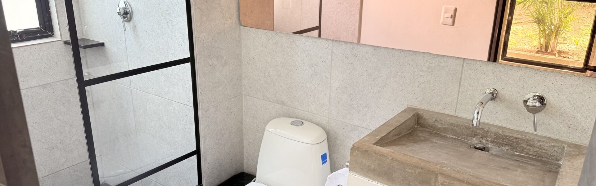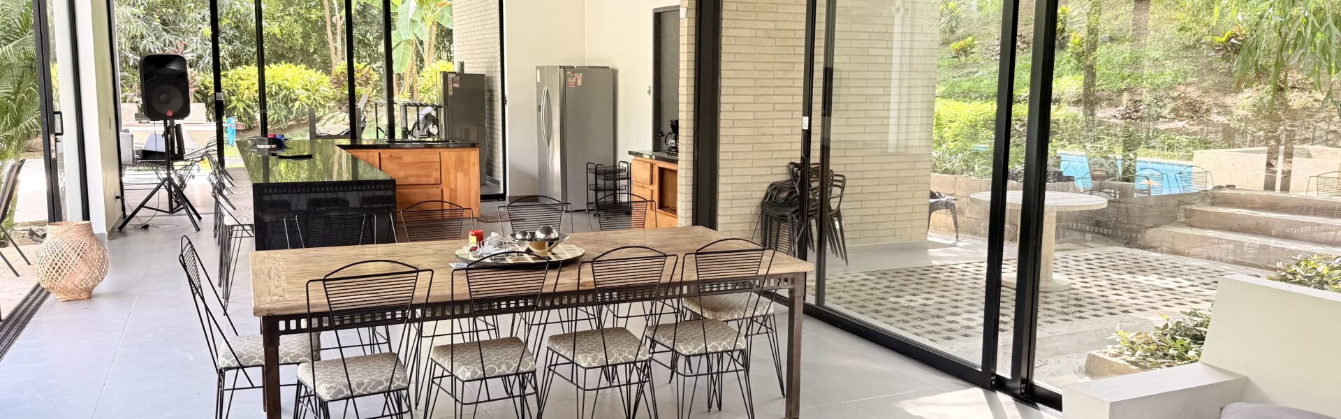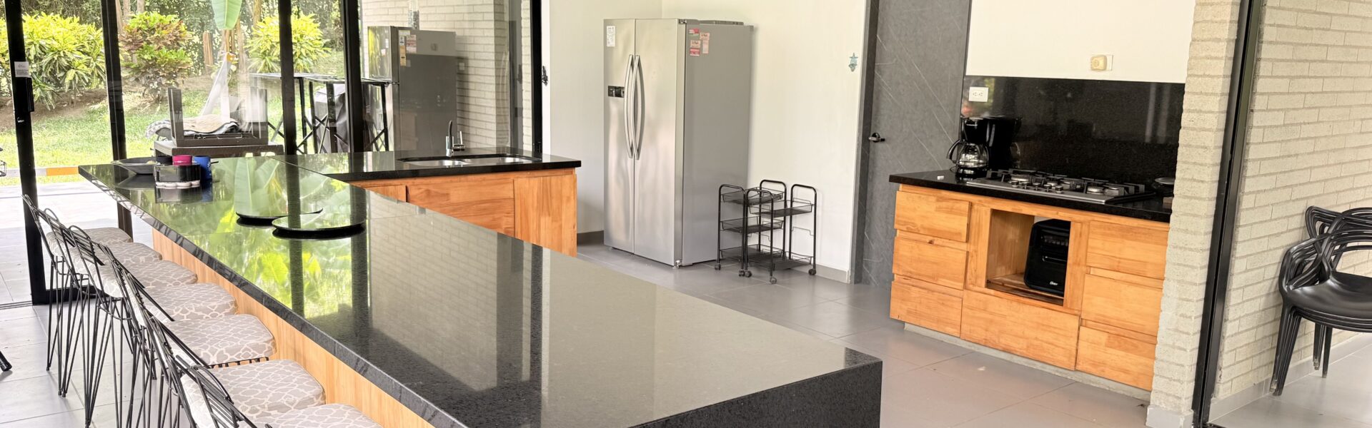 La Finca tiene una Casa moderna y muy cómoda de dos niveles, en estructura metálica, espacios amplios, con 4 alcobas con aire acondicionado y ventiladores de techo, baño y vestier ,sala comedor, cocina integral, zona de ropas,bellos jardines.